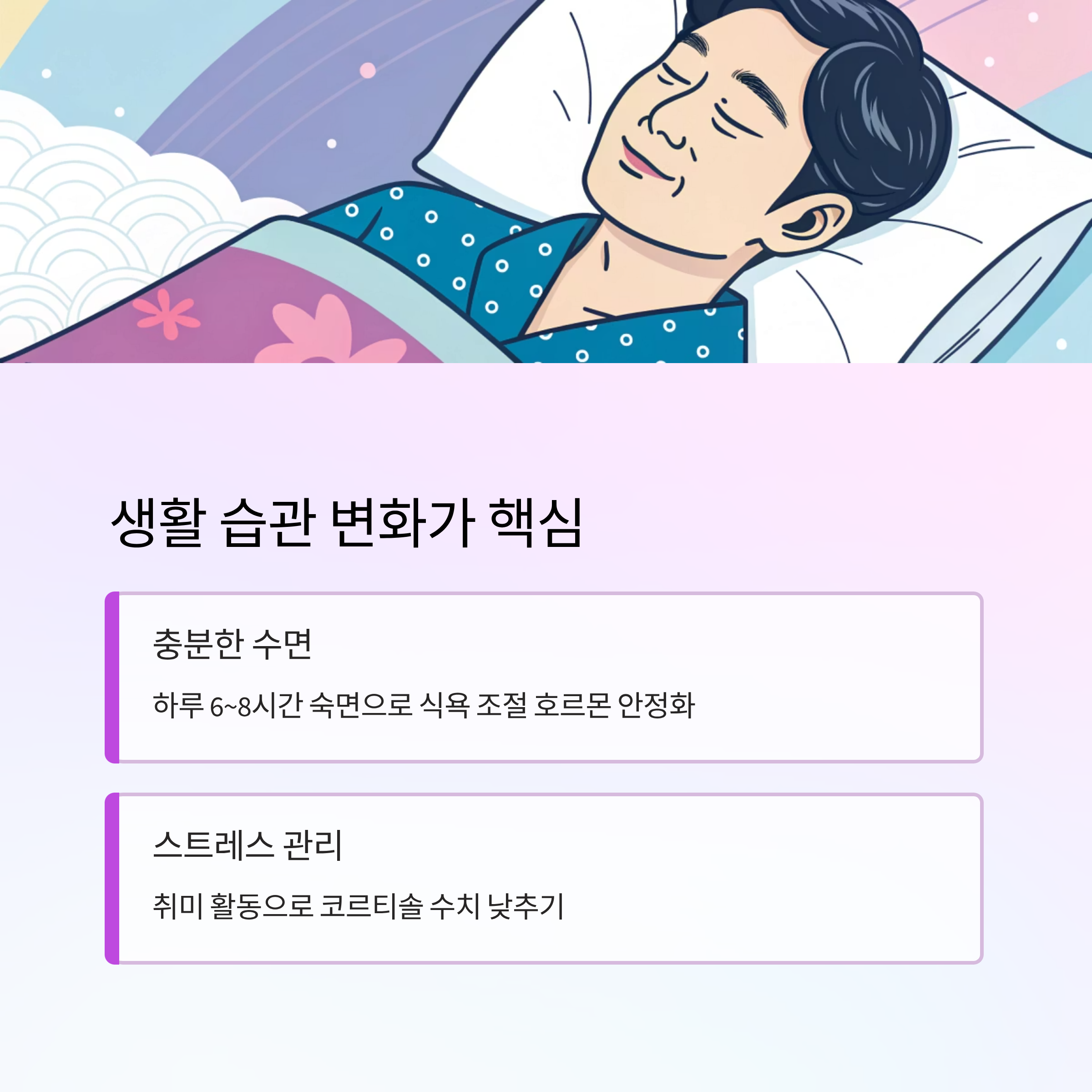 | 수면 관리 | 하루 6~8시간 숙면 | 호르몬 균형, 식욕 억제 |