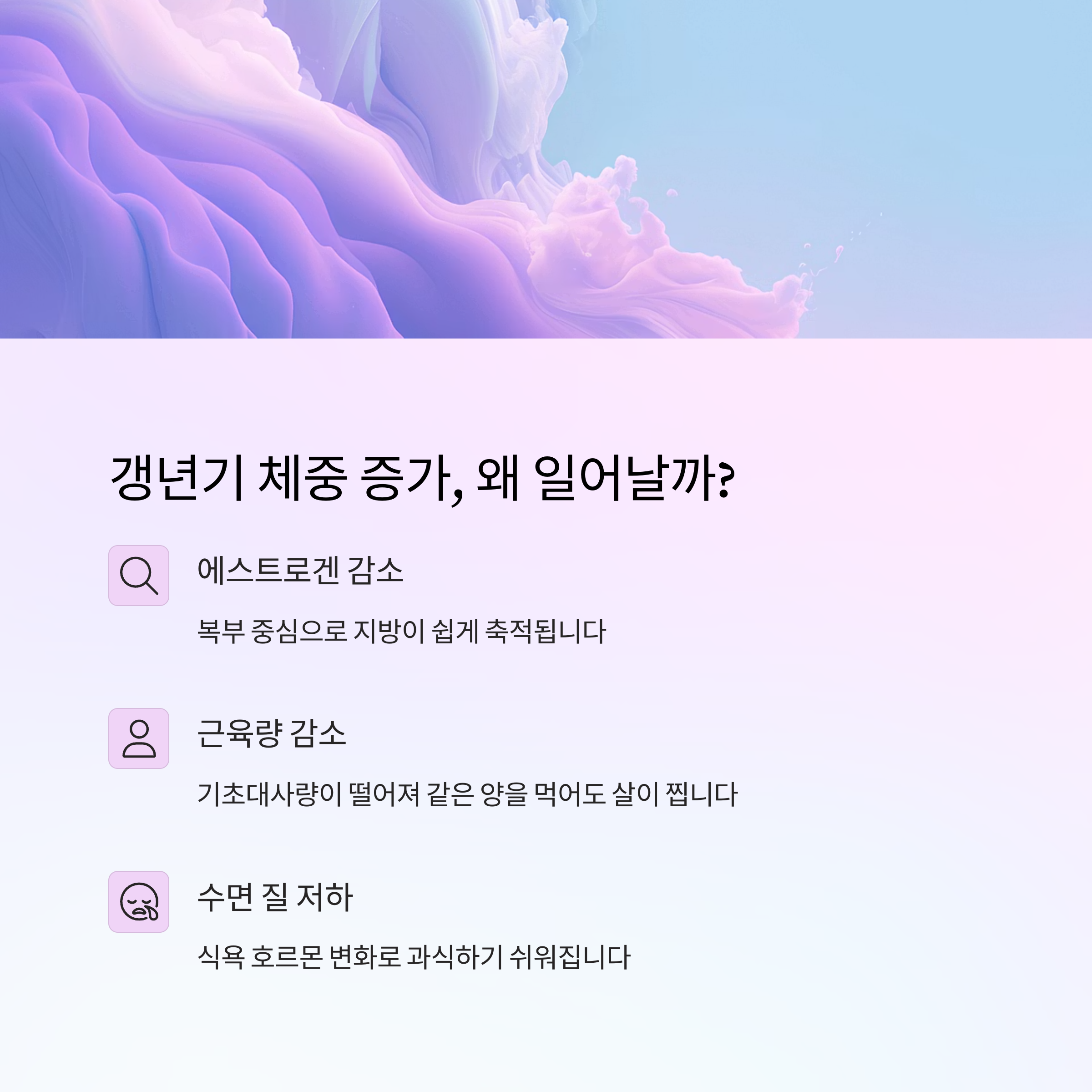 | 호르몬 변화 | 에스트로겐 감소 | 지방 축적 증가 |