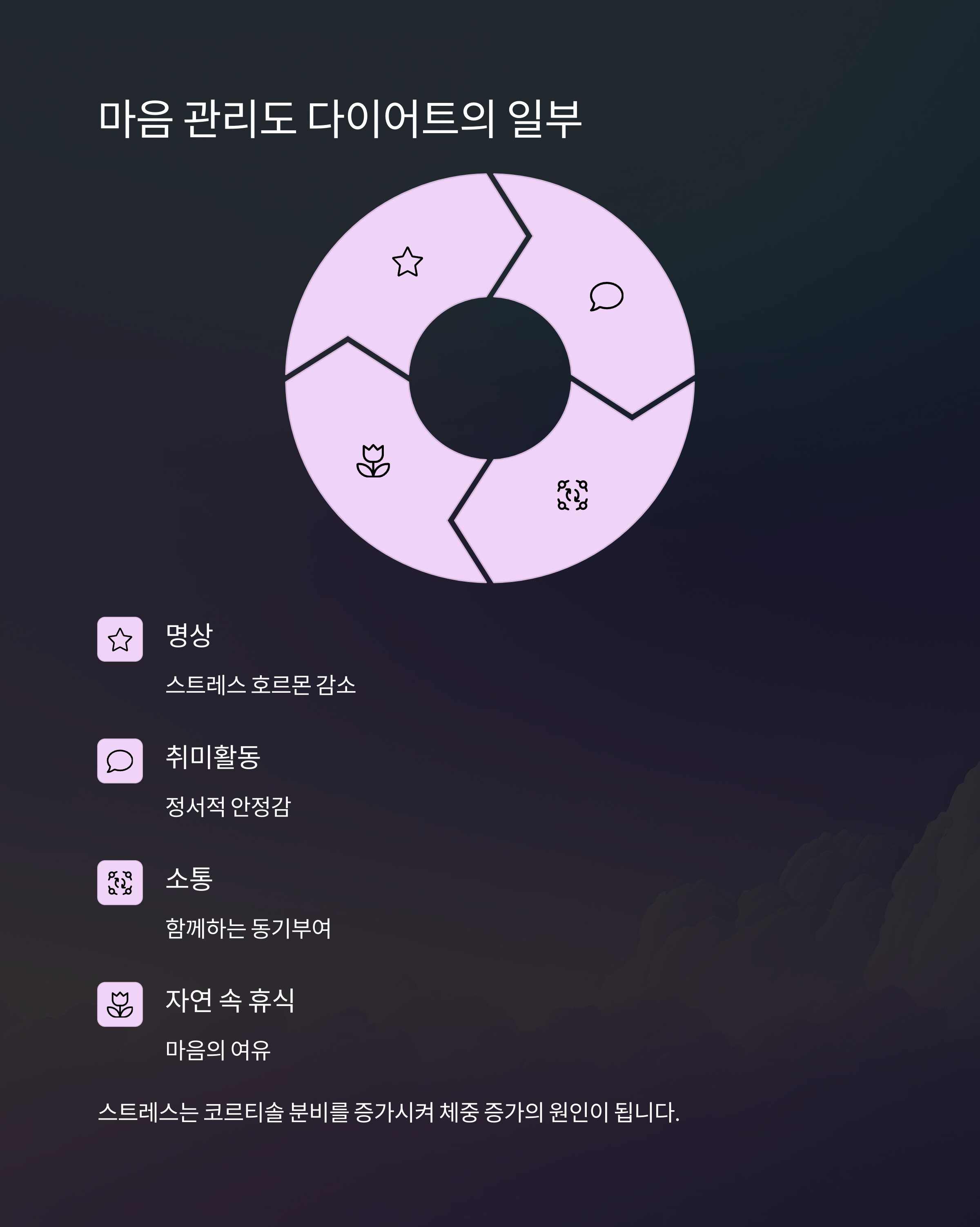 심리적인 부분도 다이어트에 큰 영향을 줘요. 스트레스를 받으면 몸은 코르티솔이라는 호르몬을 분비하고, 이 호르몬은 지방을 저장하는 방향으로 작용해요. 결국 스트레스는 체중 증가의 또 다른 원인이죠.
