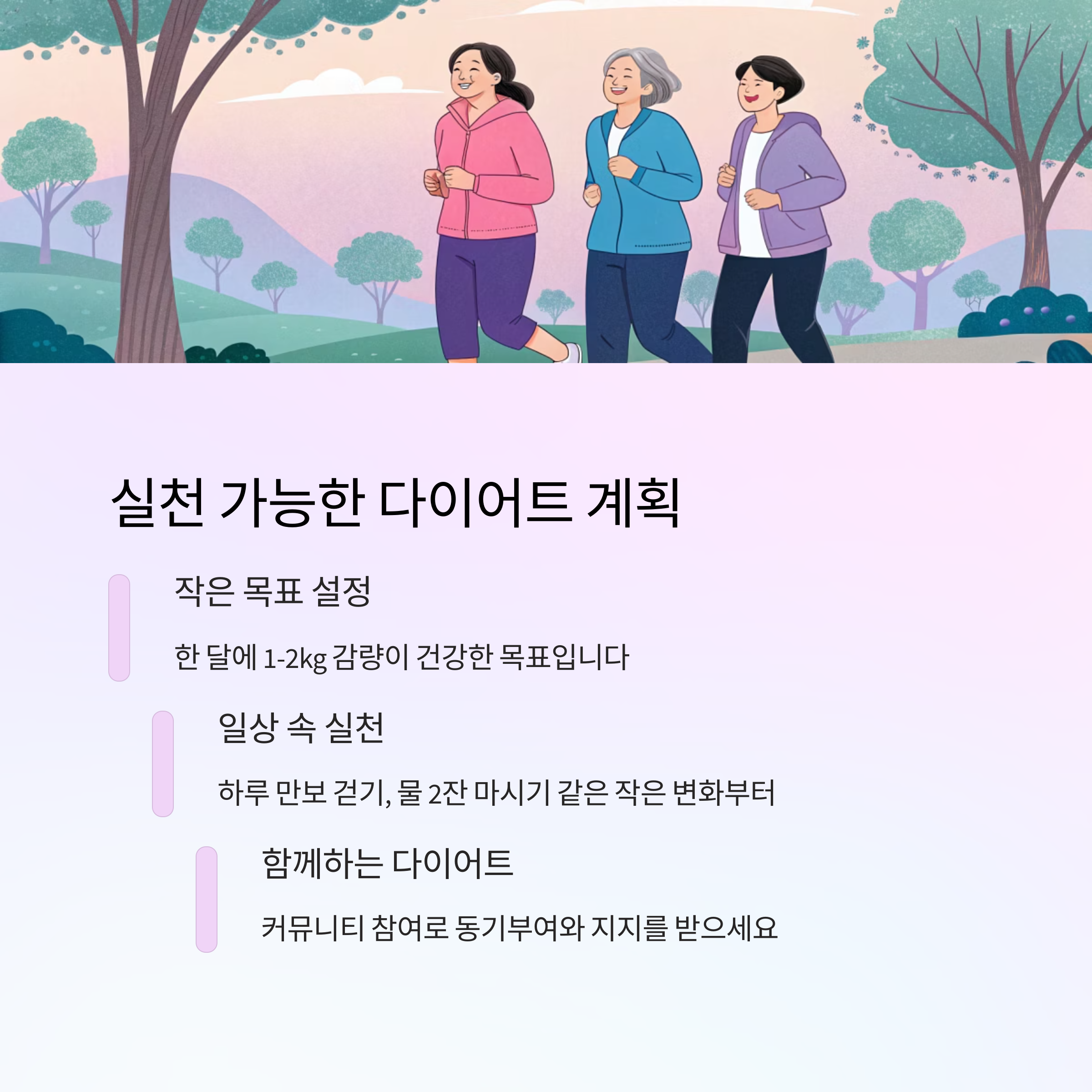 무엇보다 실패하더라도 좌절하지 말고 다시 시작하면 돼요. 완벽한 계획보다 유연한 태도와 지속적인 실천이 다이어트의 진짜 성공 비결이랍니다.