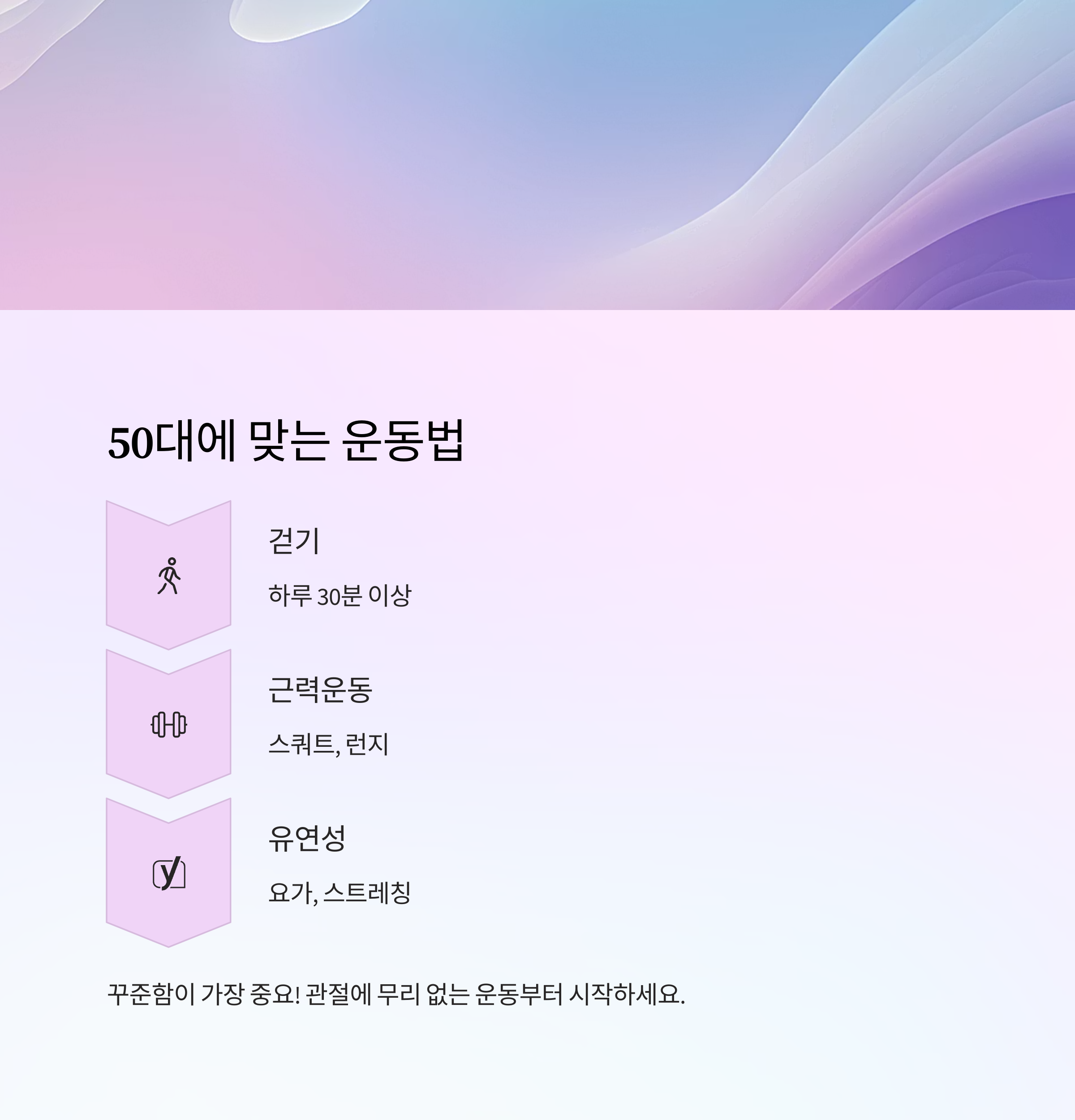 50대 여성의 운동은 '꾸준함'이 가장 중요해요. 무리한 고강도 운동보다는 일상에서 지속 가능하게 할 수 있는 운동 루틴을 만드는 것이 핵심이에요. 걷기, 자전거 타기, 요가, 스트레칭부터 시작해보세요.