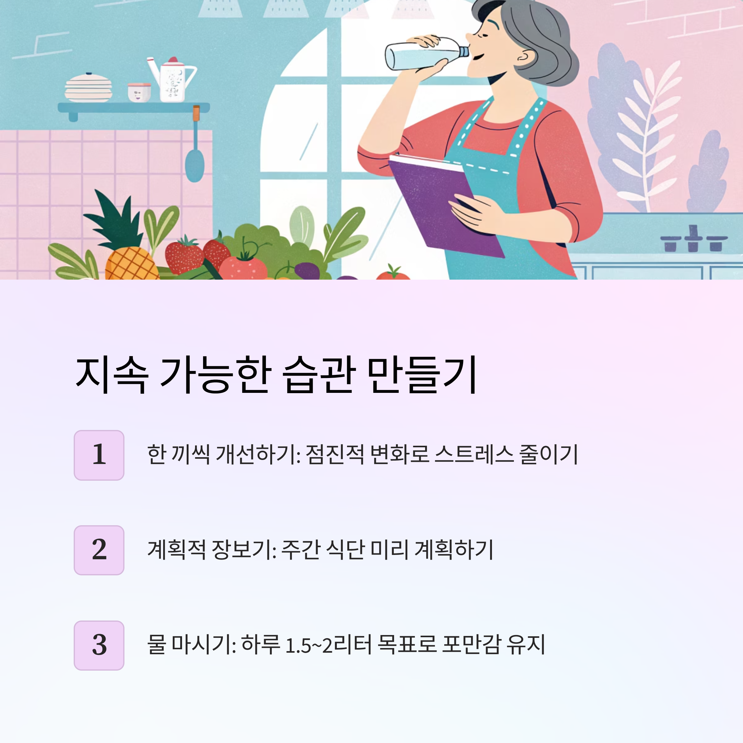 | 수분 섭취 | 하루 2리터 목표 | 포만감 증가, 노폐물 배출 |