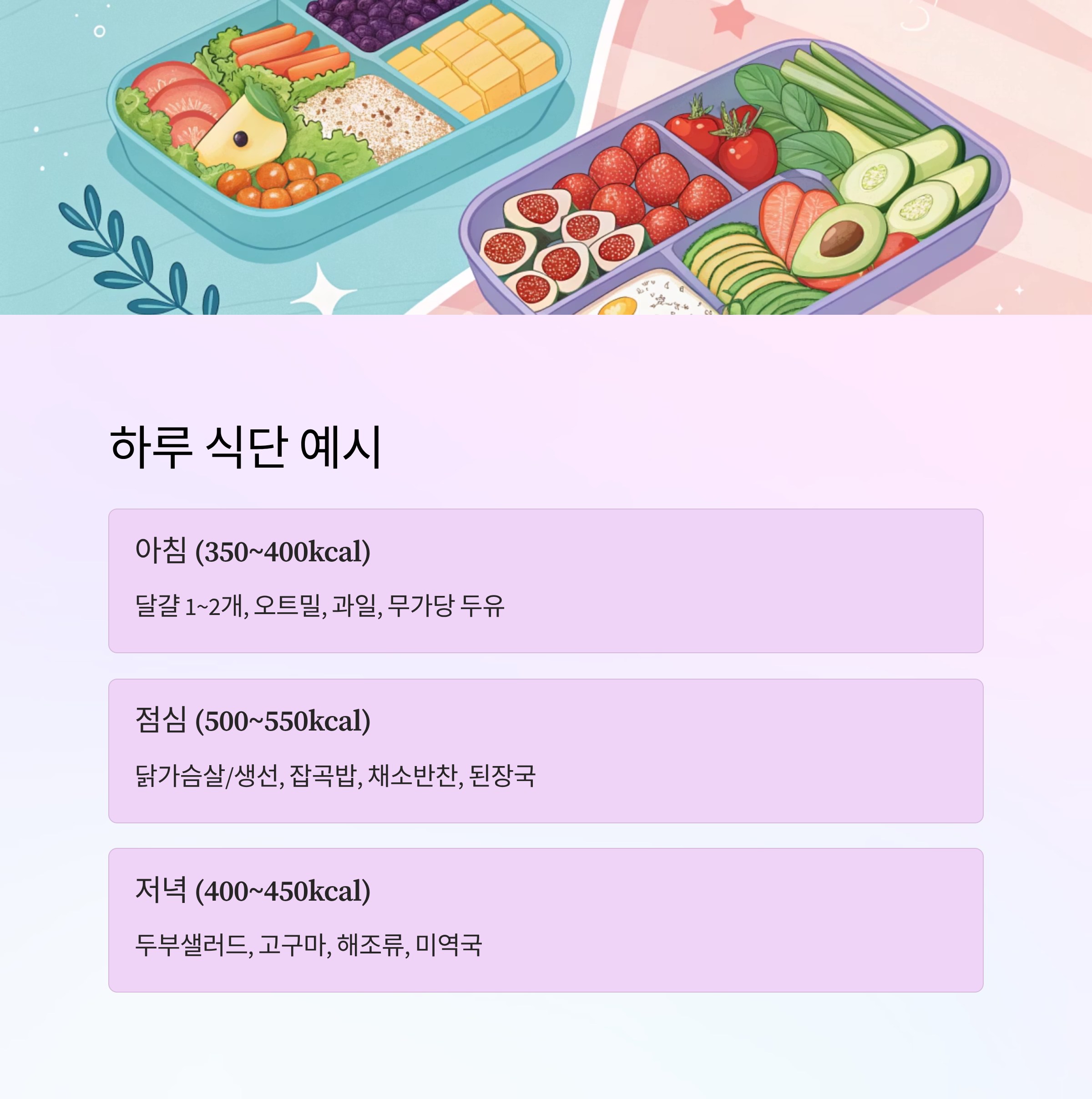 | 저녁 | 샐러드, 고구마, 미역국 | 400~450kcal | 가벼운 단백질, 저염 |